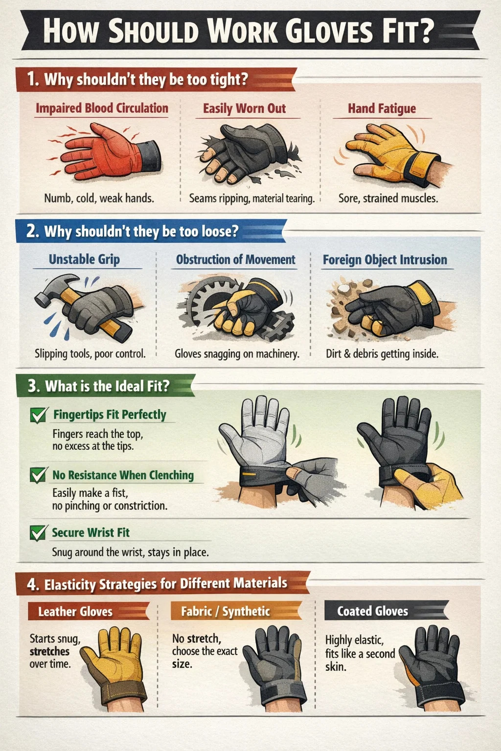 Az a kérdés, hogy a munkakesztyűnek szorosnak vagy lazának kell-e lennie, valójában nagyon fontos. Egyszerűen fogalmazva, úgy kell illeszkedniük, mint egy "második bőr", de semmiképpen nem szoríthatják össze a kezét.