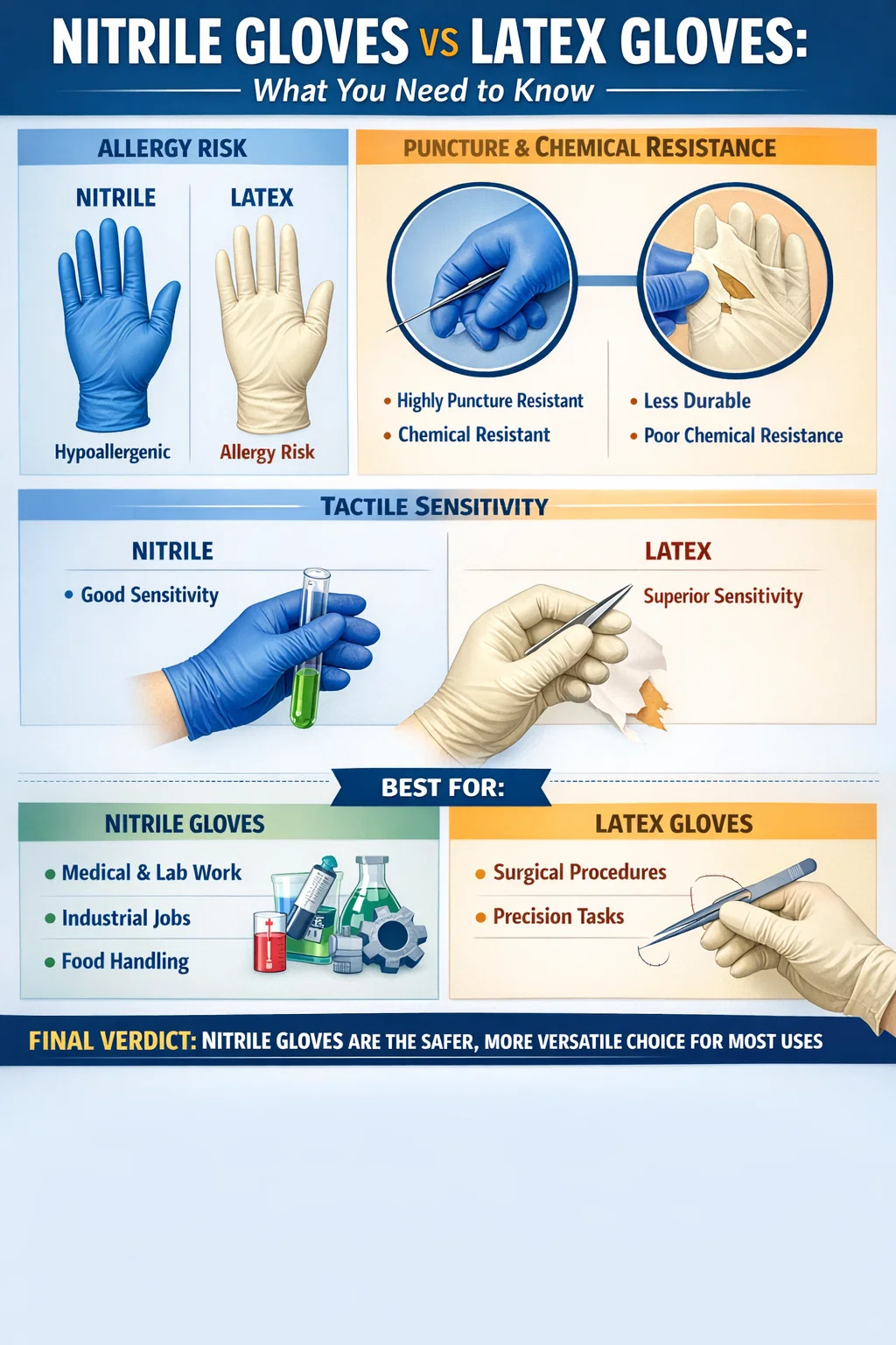 Ha mérlegeli az allergia kockázatát, a szúrásállóságot, a vegyszerállóságot, a tartósságot és az intézményi egészségügyi politika irányát globálisan, a nitril kesztyűk a biztonságosabb és praktikusabb választás az esetek túlnyomó többségében . A latexallergia kockázatának kiküszöbölése önmagában is elég kényszerítő erejű ahhoz, hogy a legtöbb egészségügyi intézmény, vendéglátóipari tevékenység és ipari munkahelyek szabványosításra kerüljenek a nitrilre.