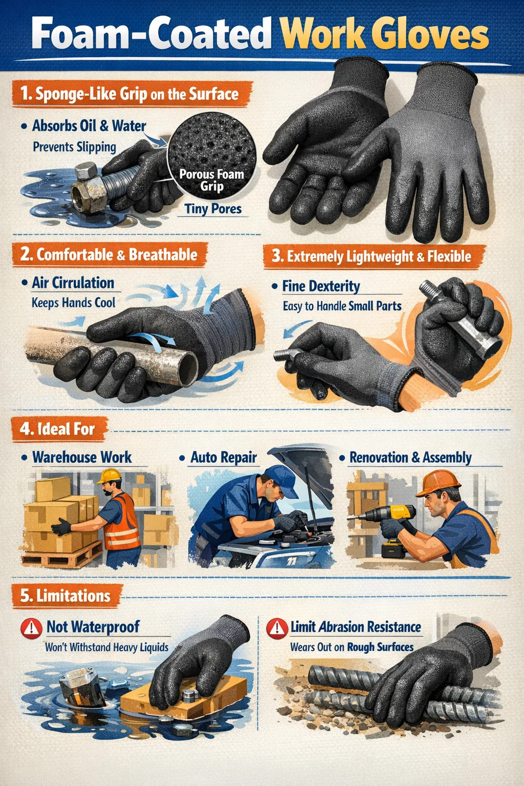 Olaj- és vízfelvétel: A bevonat mikroszkopikusan olyan, mint egy szivacs, tele apró pórusokkal. Amikor olajjal vagy vízzel borított részeket fog meg, ezek a kis lyukak felszívják a folyadékot, lehetővé téve, hogy a kesztyű felülete szilárdan tartsa a tárgyat, és megakadályozza a csúszást.