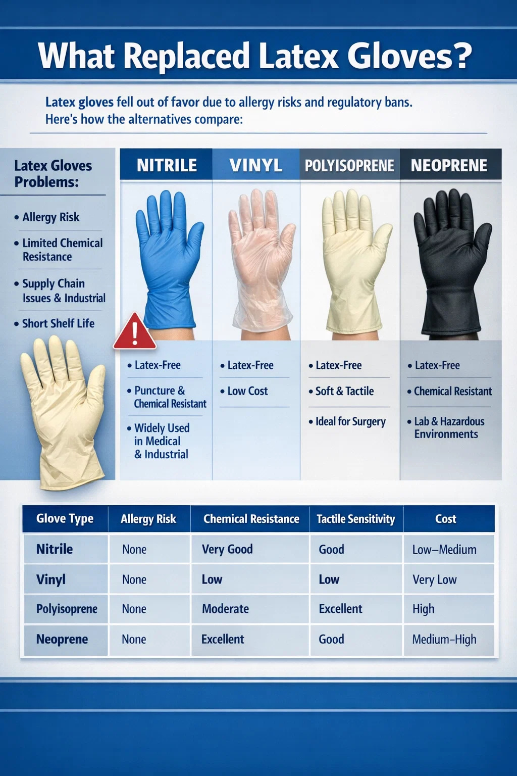 Ha közvetlen választ keres, a nitril kesztyűk manapság a legtöbb iparágban a latex kesztyűk domináns helyettesítői. Akár kórházakban, fogászati klinikákon, élelmiszer-feldolgozó üzemekben vagy autóipari műhelyekben, a nitril megelőzte a latexet, mint a választott kesztyűanyagot. Ez az eltolódás az 1990-es években kezdett felgyorsulni, amikor a latexallergia aránya az egészségügyi dolgozók körében riasztó szintre emelkedett – egyes tanulmányok olyan magas szenzibilizációs arányt találtak, mint 17% a rendszeresen kitett egészségügyi szakemberek körében . Azóta a gyártók, a szabályozó hatóságok és a beszerzési csapatok egyre inkább a latexmentes alternatívákat részesítik előnyben.
