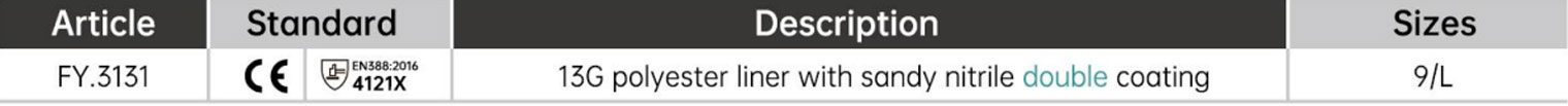 A dupla nitril homokos tenyérbevonat magas olajállóságot és jó tapadást biztosít száraz, nedves és olajos körülmények között.